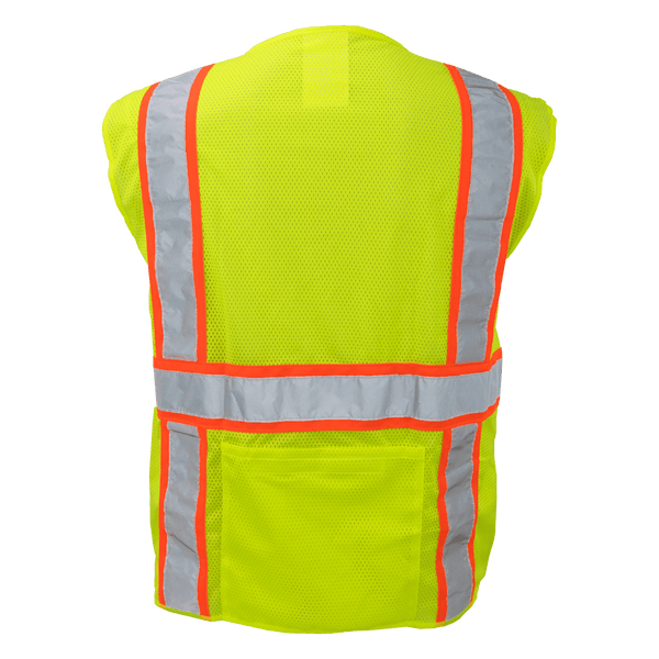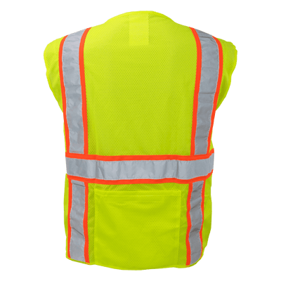 - Surveyor safety vest with lime or orange polyester fabric on front, mesh on back and matching lime binding