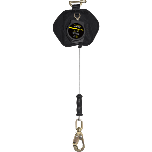 - 8 ft cable SRL with a steel snap hook that is 360° rotating and has a 3600 lb gate strength. Connector included